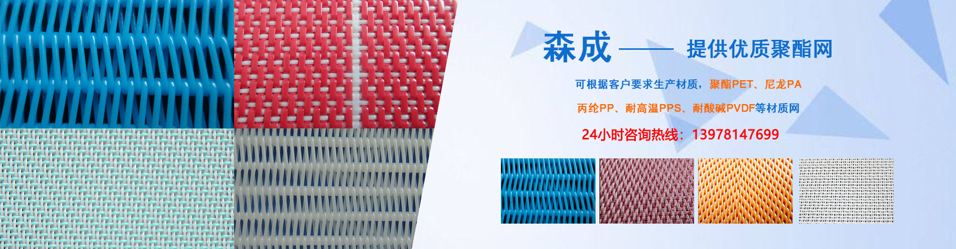 同時主導產品還有:聚酯成型網,聚酯平織干網、聚酯螺旋干網、聚酯銅絲抗靜電網,主要用于造紙、環保、印染、洗煤、石油化工、制藥、食品烘干、人造板廠、冶金、電廠脫硫、礦業、發酵等行業。公司產品具有耐酸堿、耐高溫、濾水好、透氣好、尺寸運行穩定的特點,憑質優價廉及優良的售前、售后服務暢銷國內還可以根據用戶要求生產各種規格型號的特殊用網,其長度、寬度、密度可根據用戶要求臨時確定,產品質量上乘,在廣大客戶中享有很高的聲譽。